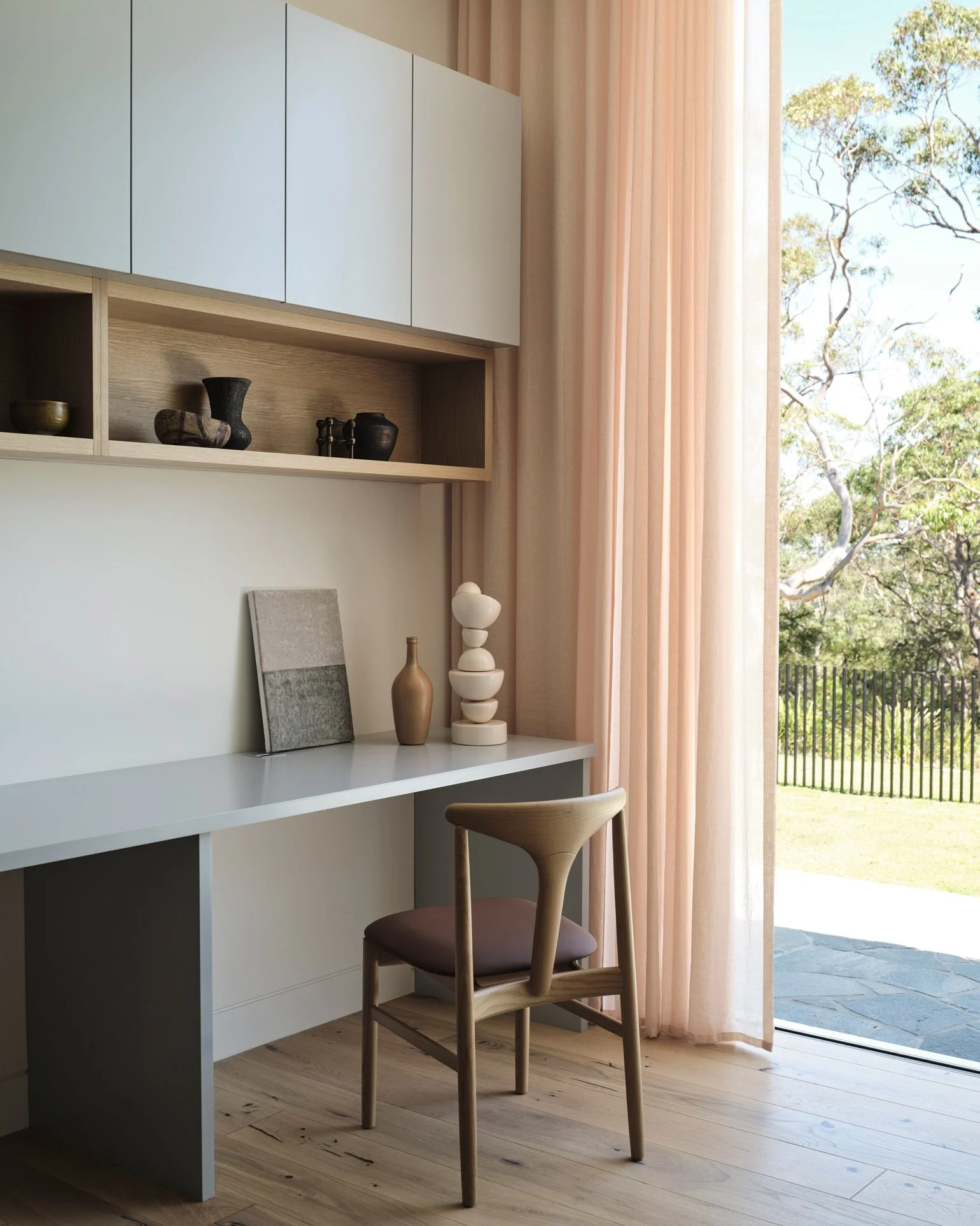 To suit a more subtle and neutral style, we chose soft pink curtains to soften the white rooms. Although the use of colour was integral to the build, the overall palette is relatively neutral which allowed the clients to add their flair with more colour and Aboriginal textiles in the same muted tones, without compromising the overall look.
