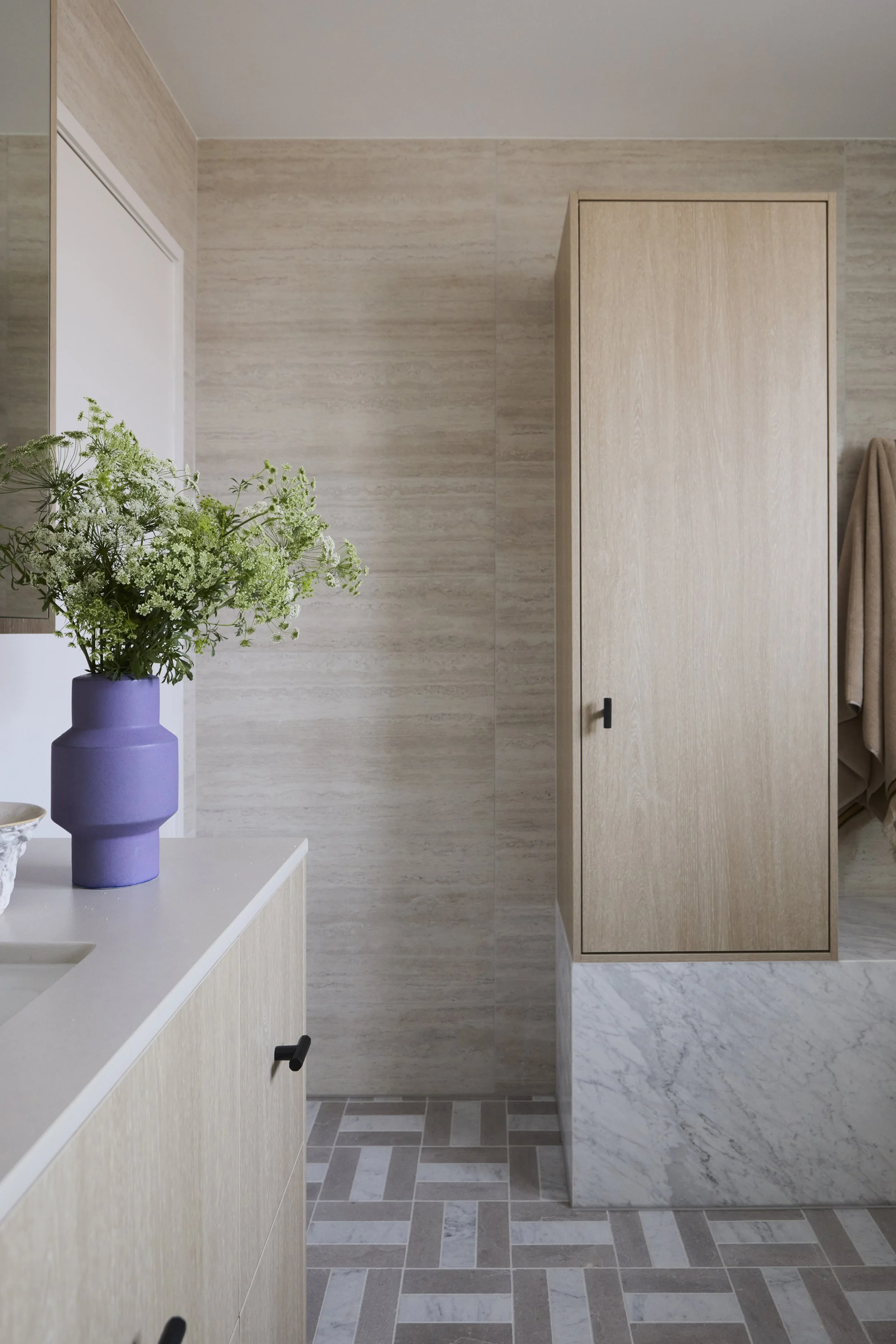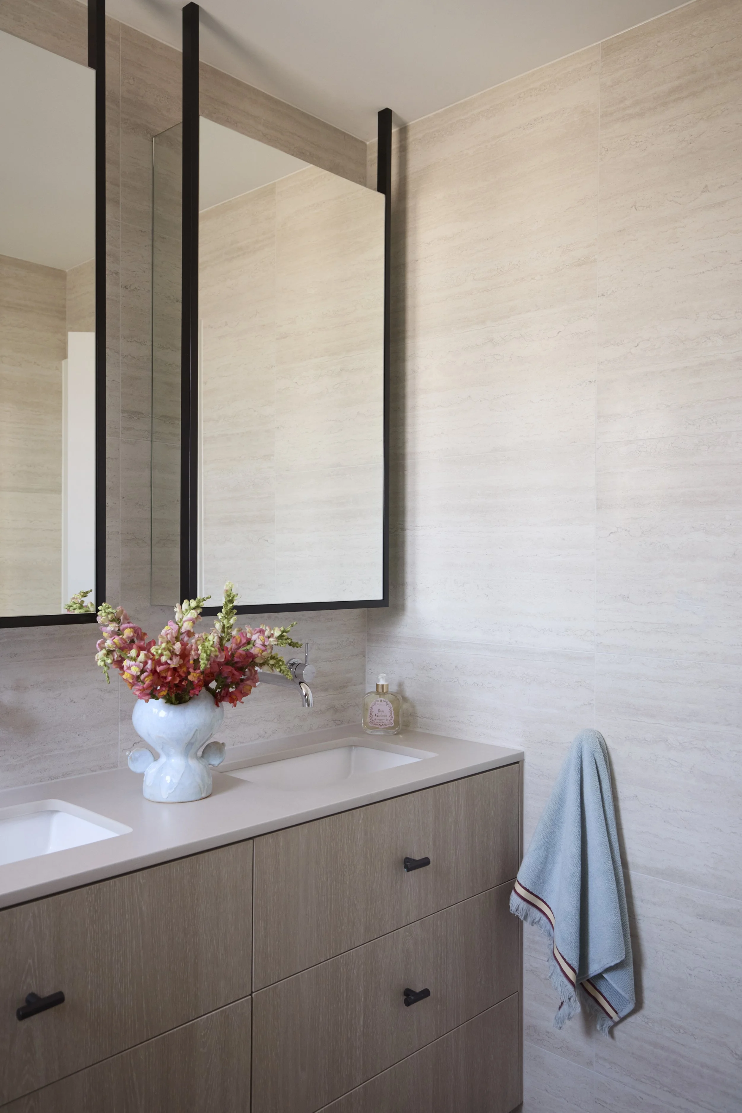 We redesigned both bathrooms upstairs with daily use in mind. The main bathroom swapped its bath for a sleek and spacious shower, featuring a combination of limestones and Carrara marble, creating a soft and elegant palette.In the master ensuite, we changed the floor tiles to the same stone as the powder room but carried the other materials through fora cohesive aesthetic.